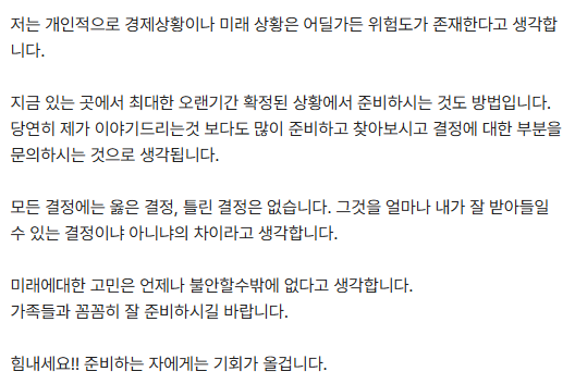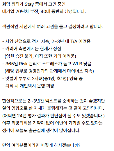 이미 나는 경력관리 초기에 두차례나 희망퇴직을 경험했던 회사원의 한명으로, 위 작성자의 고난과 어려움, 그리고 말하지 못할 다양한 사연이 있겠다는 공감이 된다.
