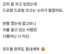 곧 나도 중년의 고개를 넘어가게 되면 그땐 우리집에서도 내 코골이 소리로 잔소리가 더 커지는 순간이 온다면