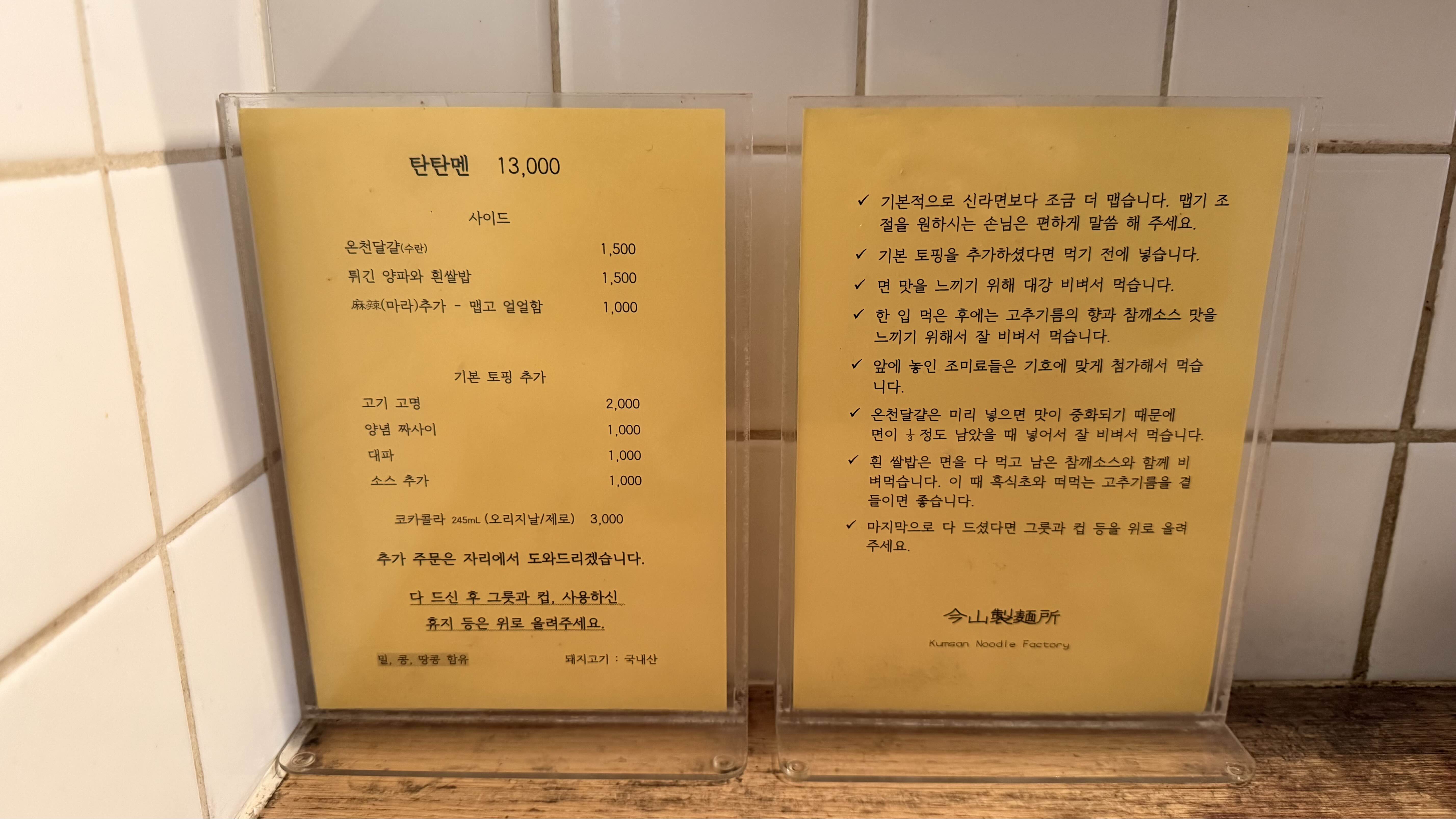 탄탄멘 단일메뉴다. 양이 좀 되는 사람은 필수로 튀긴양파와 흰쌀밥, 그리고 온천달걀은 무조건 추가하길 추천한다.