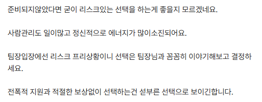 물론 상위 메니져가 관리차원에서 쉽게 가려고 결정한 것,으로 판단되기에 내 댓글은 선택하지 않으라 조언하였다, 이라면, 그만큼 회사에서는 뇌없이 결졍한 것이라 추정할수밖에 없다. 비판이라는 의견이 있을 수 있지만, 저연차에게 팀을 맡기고 믿는다는 말로 대충 때우려는 것으로밖에 보이지 않기때문에, 이는 준비없이 벼랑끝에 세워두고 등을 미는것과 같은 상황이라 생각해야한다.