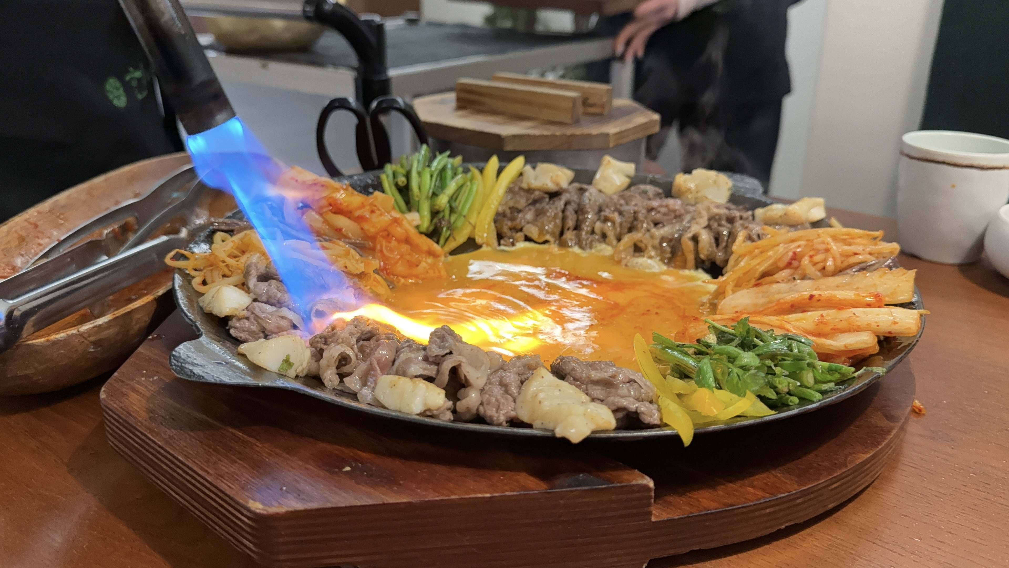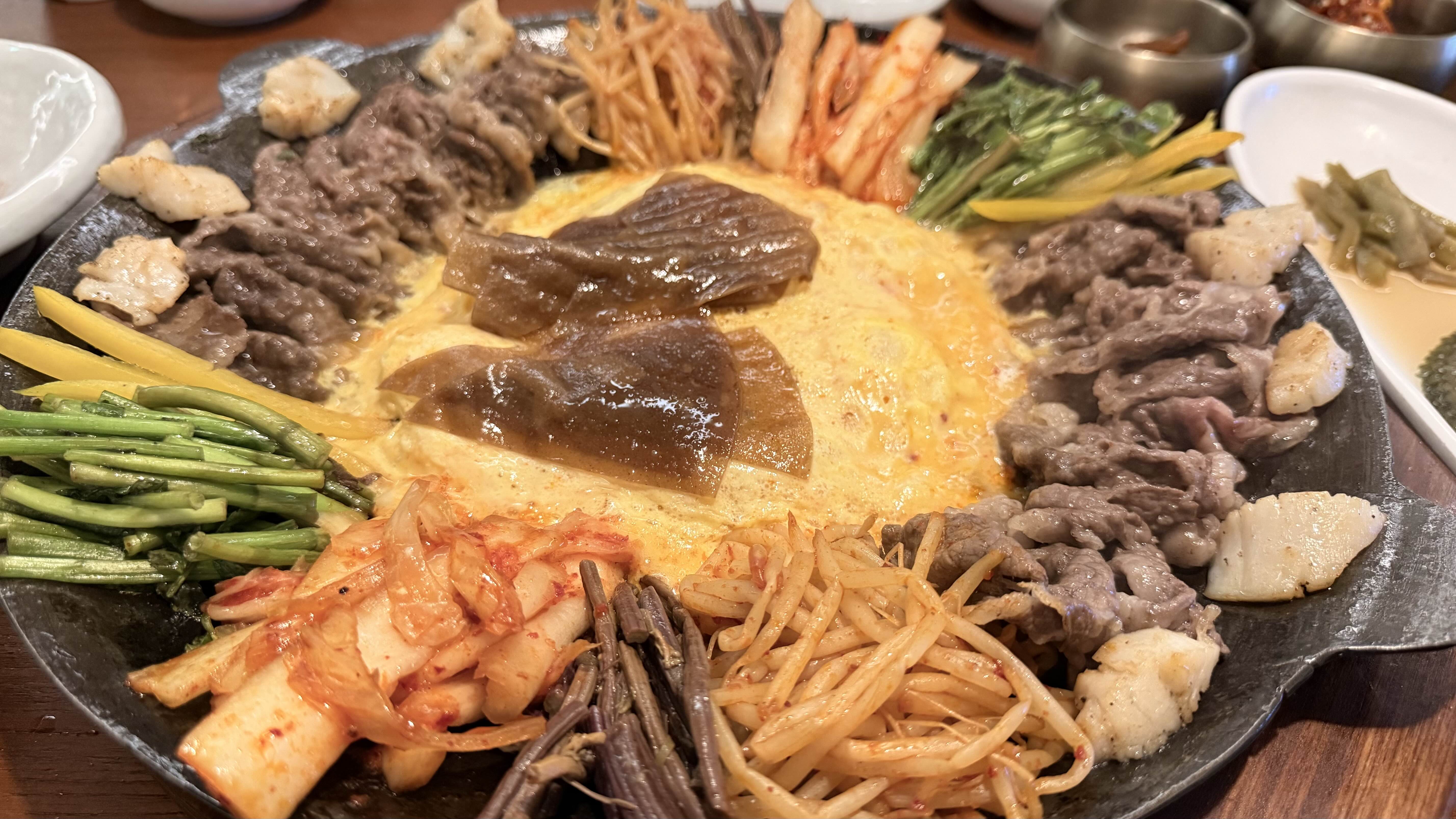 차돌로 잔뜩기름을 내어 살짝 채소를 구워 예쁘게 데코해주시고, 가운데 달걀찜처럼 달걀물을 부어주셨어요. 불쑈 두번 보실수있습니다.